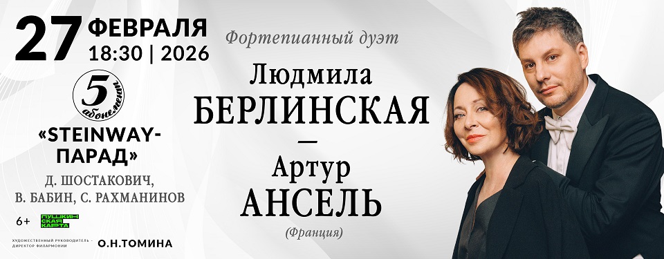 Рады сообщить новую дату концерта Людмилы Берлинской и Артура Анселя — выступление фортепианного дуэта состоится 27 февраля 2026 года.